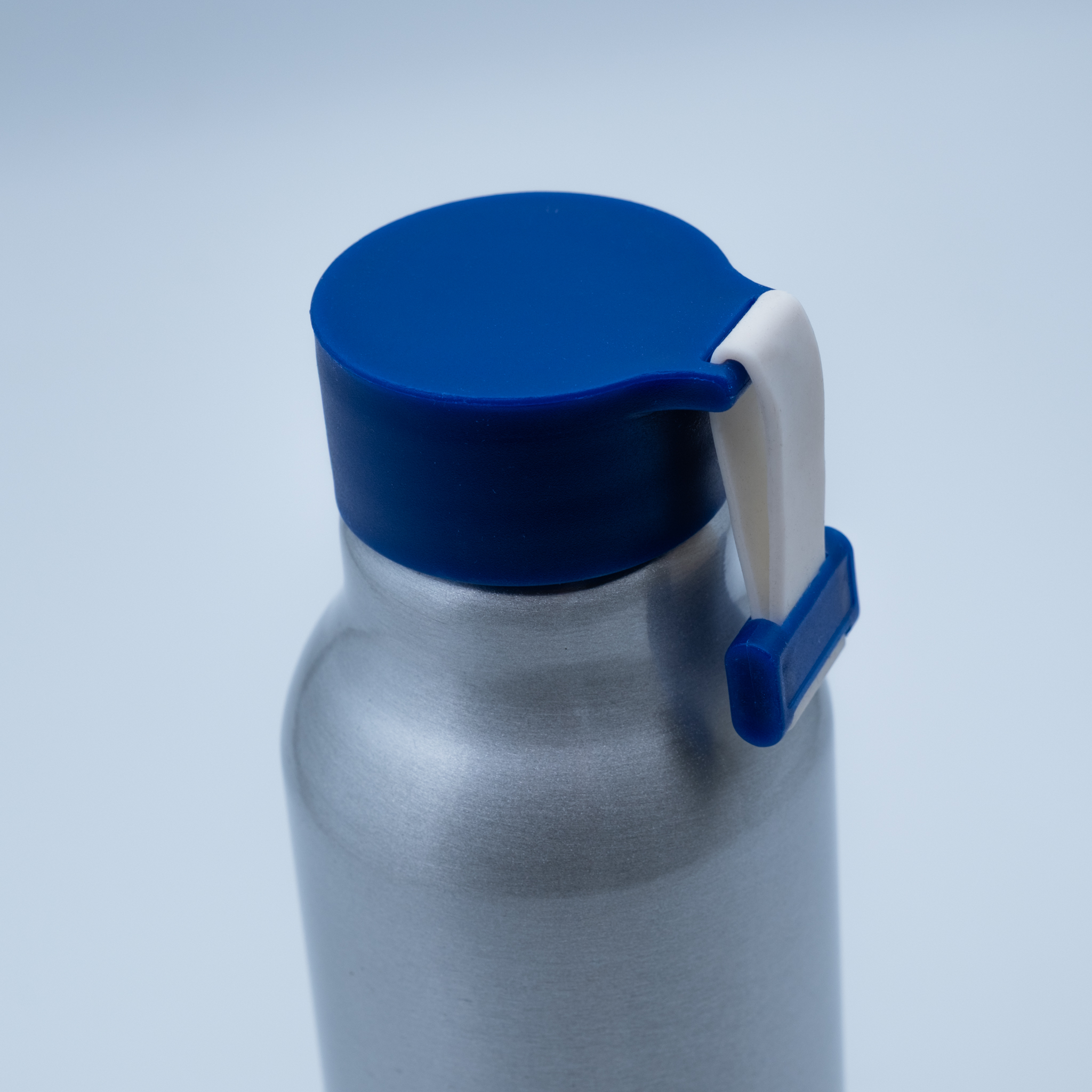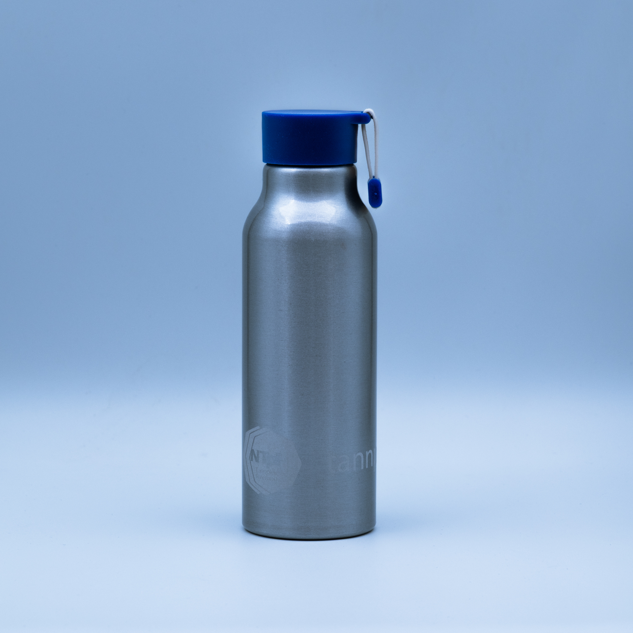 Kategori: Profilartikler Stikkord: 500 ml, bærestropp, blått lokk, BPA-fri, holder drikken kald, lett å rengjøre, miljøvennlig, NTpF-logo, rustfri drikkeflaske, slitesterk, sølv